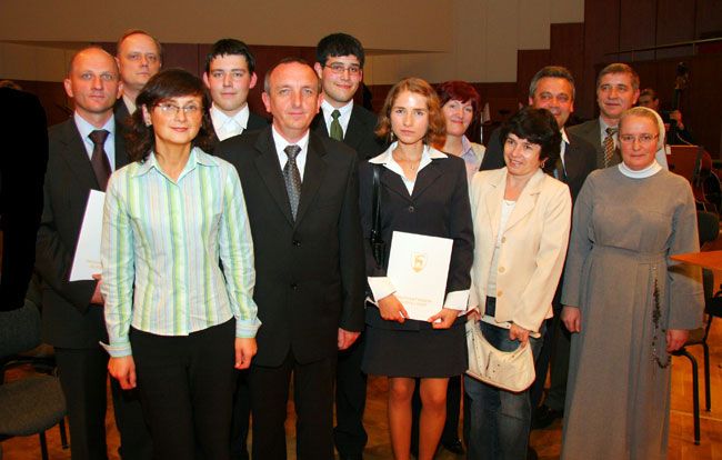 Wspólne zdjęcie wyróżnionych byłych uczniów z nauczycielami i dyrektorem Pawłem Domagałą.