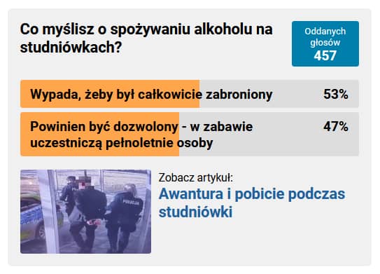 W sondzie wzięło udział 457 osób, a pytanie brzmiało: "Co myślisz o spożywaniu alkoholu na studniówkach?". 53% osób głosowało za odpowiedzią "Wypada, żeby był całkowicie zabroniony". 47% ankietowanych odparło, że powinien być legalny, skoro w zabawie biorą udział pełnoletnie osoby.