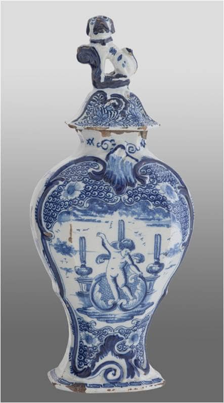 Wazon z pokrywą, Holandia, Delft, poł. XVIII w., fajans, szkliwo ołowiowo – cynowe, malowanie kobaltem.
