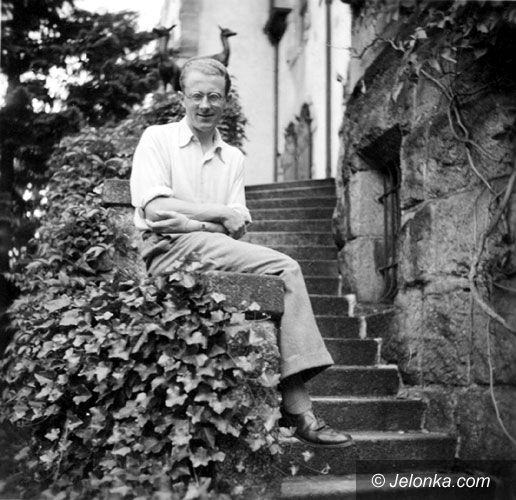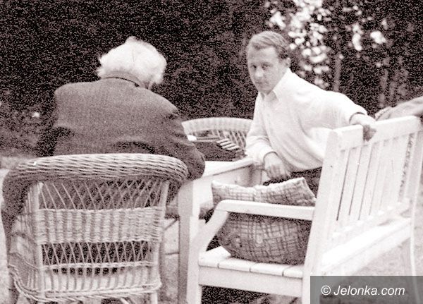 Erhart Kästner przy schodach prowadzących do głównego wejścia rezydencji noblisty.
