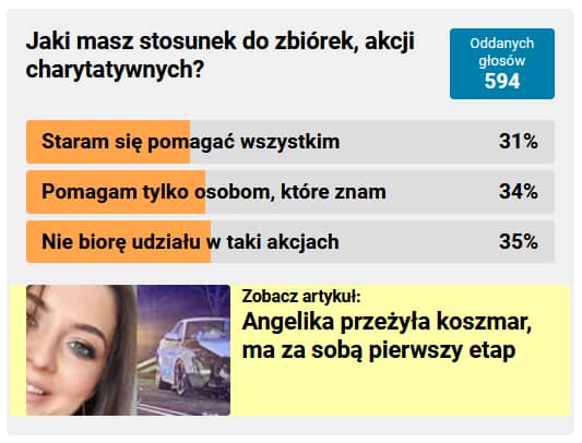 Udział w sondzie wzięły 594 osoby, wyniki ułożyły się niemal identycznie, co nie jest obrazkiem częstym. Na pytanie "Jaki masz stosunek do zbiórek, akcji charytatywnych?" 35% ankietowanych odparło, że nie bierze udziału w takich przedsięwzięciach. Pozostali chętnie biorą udział w akcjach, ale...