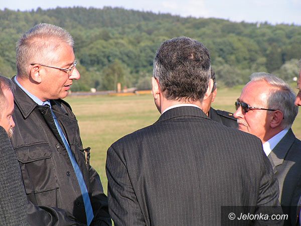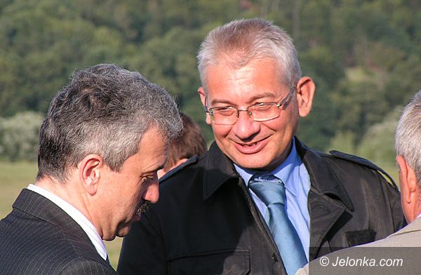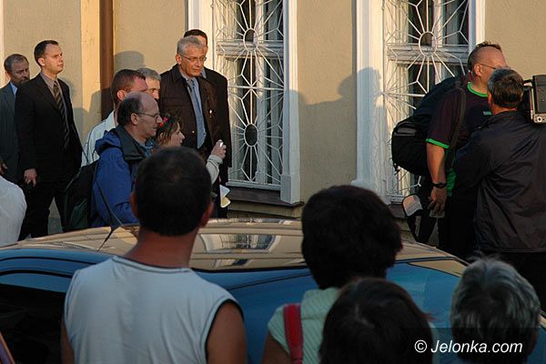 Wicepremier Dorn w obstawie ochroniarzy przed urzędem miasta w Piechowicach.