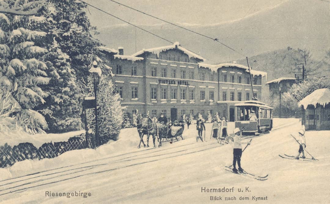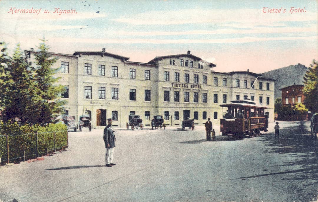 Hotel Tietze'go (dziś Wyższa Szkoła Menadżerska) w Sobieszowie, końcowy przystanek tramwajów. Latem dorożki, a zimą – sanie dowoziły stąd podróżnych do podnóża Chojnika, stąd tragarze wnosili ich do zamku