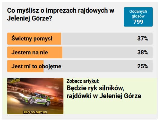 W naszej ostatniej sondzie pytaliśmy Czytelników o sam pomysł organizacji imprez rajdowych w Jeleniej Górze. Fanów rajdów jest dużo. W głosowaniu wzięło udział 799 osób. 37% ankietowanych uważa, że to znakomity pomysł, podobna liczba (38%) jest na nie, a pozostali nie mają zdania.