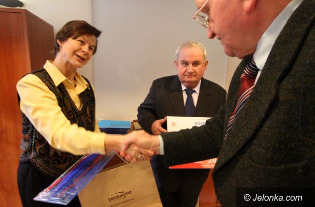 Iwona Friedrich pokazuje nagrodzoną "pracę". W tle "Złoty Laureat" – Jerzy Andrzejczak.
