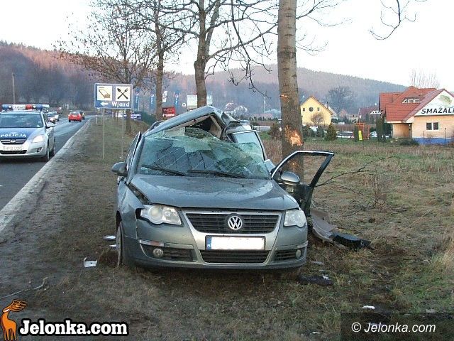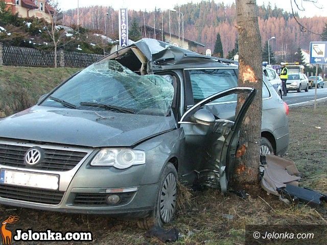 Groźny wypadek przy Hotelu Jan. Volkswagenem w drzewo