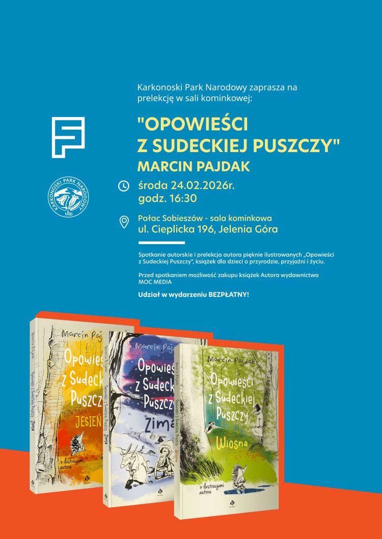 Serdecznie zapraszamy na prelekcję w sali kominkowej Pałacu Sobieszów - będzie to spotkanie autorskie z Marcinem Pajdakiem, autorem pięknie ilustrowanych „Opowieści z Sudeckiej Puszczy”, książek dla dzieci o przyrodzie, przyjaźni i życiu.