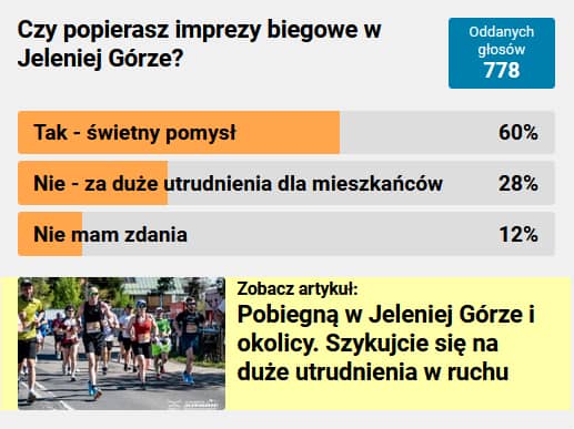Czytelnicy mierzyli się z pytaniem: "Czy popierasz imprezy biegowe w Jeleniej Górze?". W głosowaniu wzięło udział 779 osób, aż 60% było zdania, że takie imprezy to dobry pomysł.