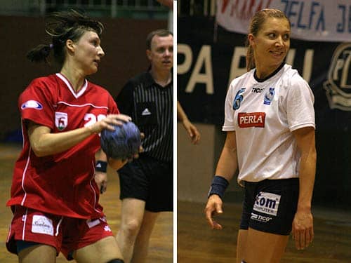 Efektowny rzut skrzydłowej Doroty Czekaj (Jelfa). Reprezentacyjna bramkarka - Magdalena Chemicz (SPR)