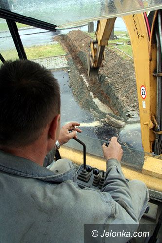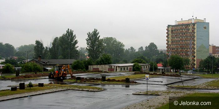 Koparka niweluje teren parkingu przed szpitalem: tu będą lądować śmigłowce.