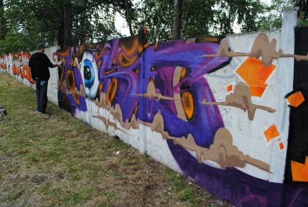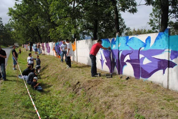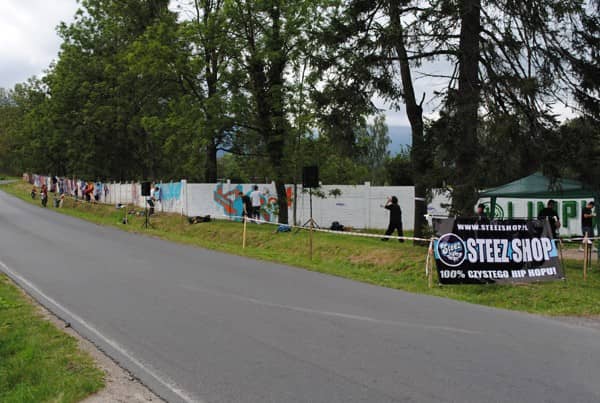 Mur stadionu w barwach graffiti. W Kowarach
