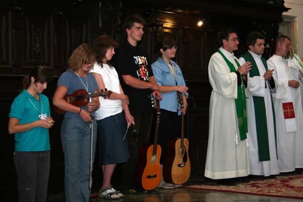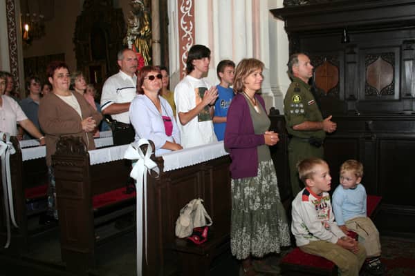 Przed wyjściem na pielgrzymi szlak uczestnicy i księża modlili się na mszy świętej w kościele św. św. Erazma i Pankracego.