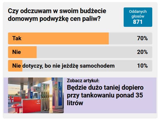 871 Czytelników wzięło udział w sondzie, odpowiadając na pytanie "Czy odczuwam w swoim budżecie domowym podwyżkę cen paliw?". Aż 70% osób odpowiedziało, że tak.
