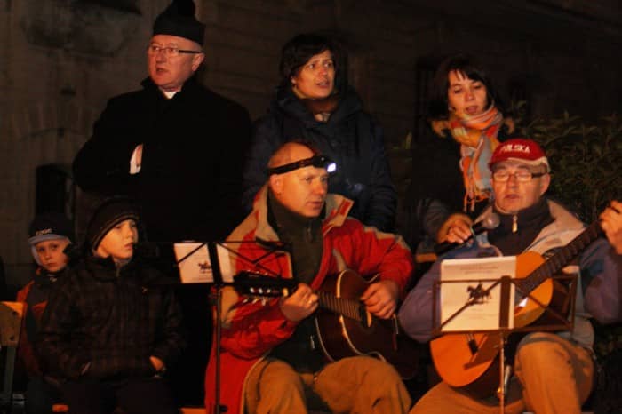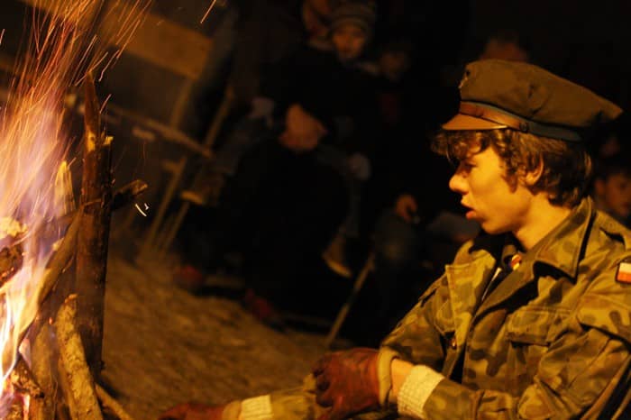 Patriotycznie przy ognisku na dziedzińcu bazyliki