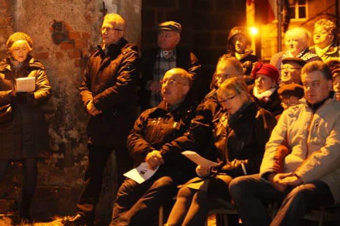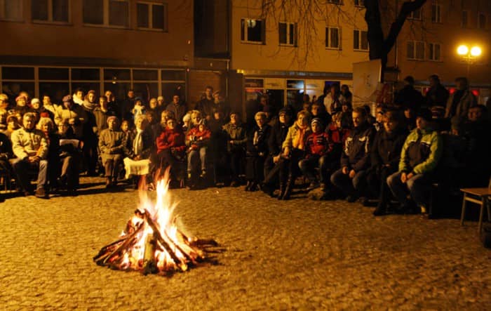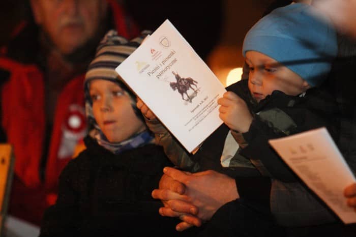 Patriotycznie przy ognisku na dziedzińcu bazyliki
