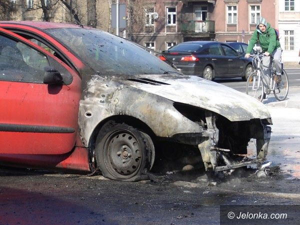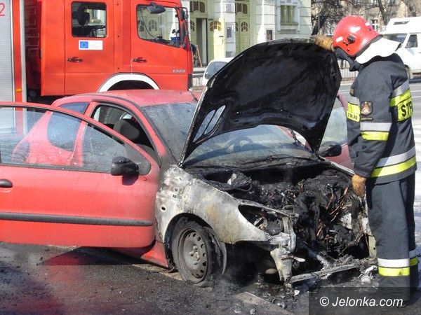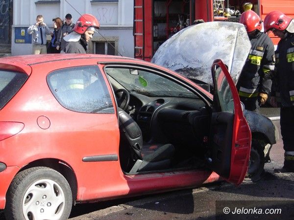 Płonący peugeot w centrum Jeleniej Góry