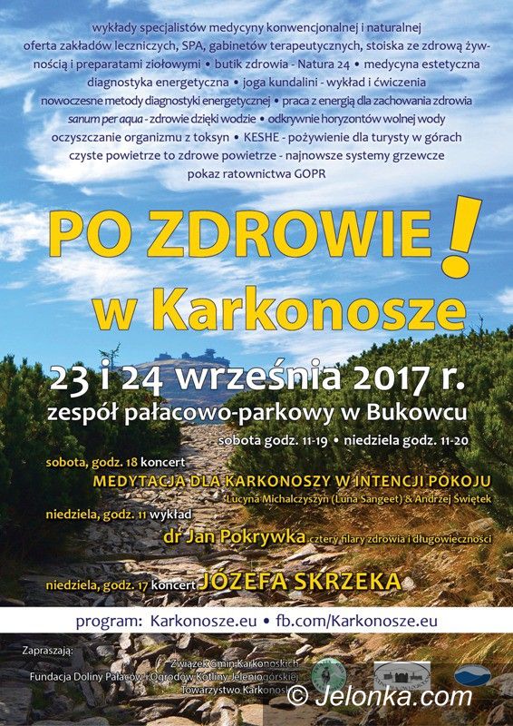 Swoją ofertę zaprezentują również zakłady lecznicze, ośrodki SPA, gabinety terapeutyczne, sprzedawcy zdrowej żywności i preparatów ziołowych. Będzie sesja leczniczo – relaksacyjna oraz koncert gongów tybetańskich i mis kryształowych. Artystyczną oprawę nada koncert Józefa Skrzeka. Program jest na tyle bogaty, że z pewnością każdy znajdzie w nim coś dla siebie. Organizatorami imprezy są: Związek Gmin Karkonoskich, Fundacja Doliny Pałaców i Ogrodów Kotliny Jeleniogórskiej, Towarzystwo Karkonoskie.