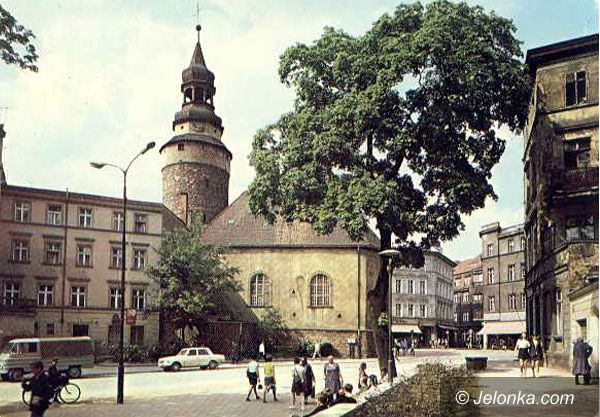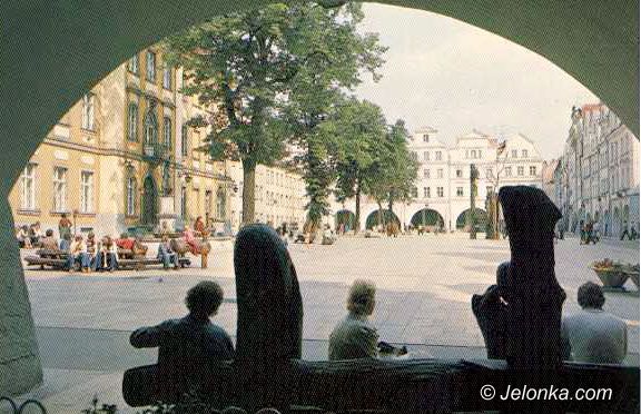Drewniane ławki stylizowanie rzeźbione na placu Ratuszowym pod koniec lat 70-tych.