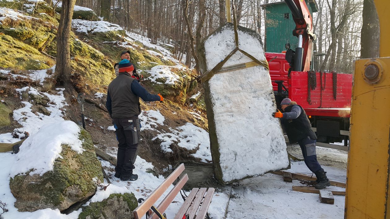 Po wielu próbach podjęto wreszcie decyzję o ustawieniu owego pomnika po drugiej stronie drogi, tuż przy schodach prowadzących na Witoszę, przed obiektem dawnej remizy strażackiej. Z samego rana 19 grudnia 2018 roku podjęto próbę przemieszczenia płyty. Najpierw trzeba było ją „wyjąć” z miejsca, na którym leżała od lat. Jak się okazało wcale nie było to takie łatwe, gdyż rosnące drzewa nie pozwalały na bliższe podjechanie dźwigu. Musiał on stanąć w pewnej odległości od strumienia. Żeby założyć łańcuchy, trzeba było z obu stron płyty nawiercić głębokie otwory, w które wsunięto grube pręty zbrojeniowe. Dopiero wtedy można było założyć łańcuchy i nadrzucić płytę nieco bliżej dźwigu. Wtedy jednak okazało się, że dźwig o nośności 5 ton nie jest w stanie podnieść pomnika. Udało się to dopiero po przyjechaniu koparki, która pomogła unieść płytę z drugiej strony. Wtedy bardzo ostrożnie wsunięto ją na przyczepę i przewieziono na drugą stronę drogi. Tam ustawiono na wcześniej przygotowanym miejscu. Plac został wyrównany, położono zbrojenie i wykonano wylewkę z betonu. Dzięki temu płyta jest stabilna i nie grozi jej przewrócenie.