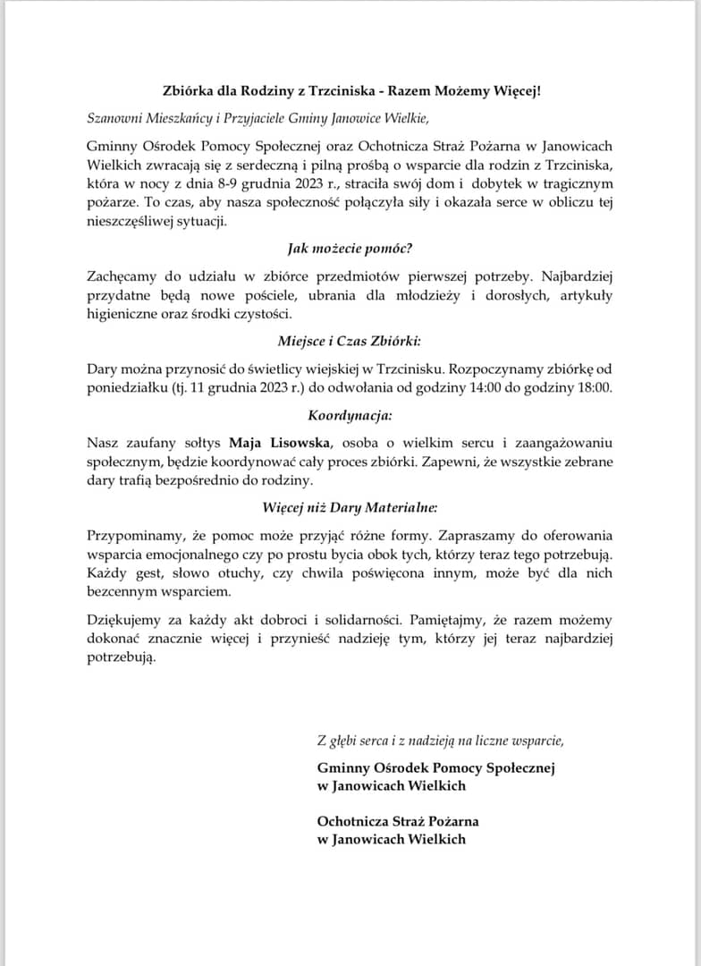 Pomoc dla pogorzelców z Trzcińska