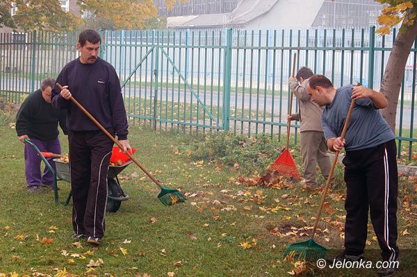 Uczestnicy WZT porządkują teren przy placówce.