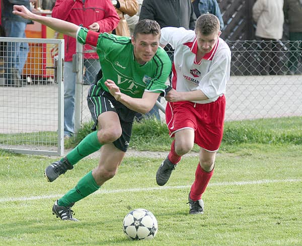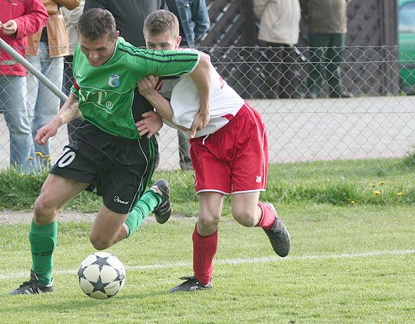 Bohater meczu w ekipie gospodarzy Kazimierz Hamowski w walce z obrońcą Łużyc.