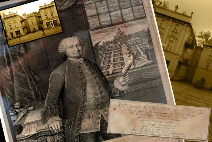 Budowniczy pałacu sportretowany w jego wnętrzu z widokiem na Kościół Łaski i cmentarz. Taki widok podziwiał także Fryderyk II.