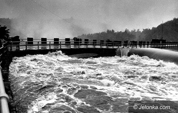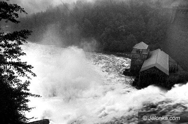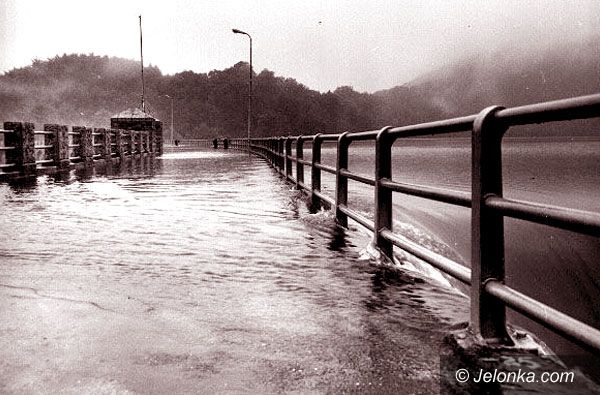 Pilchowice żywiołowe: powódź z 1977 roku. Woda przelewa się przez tamę.