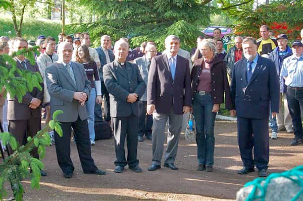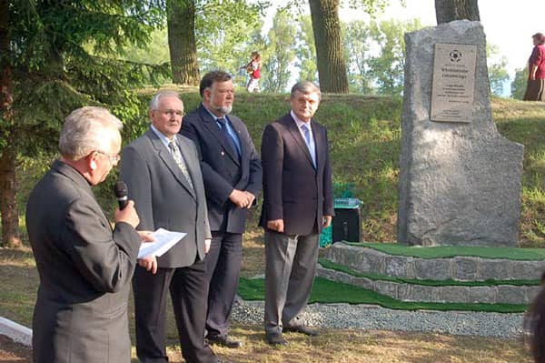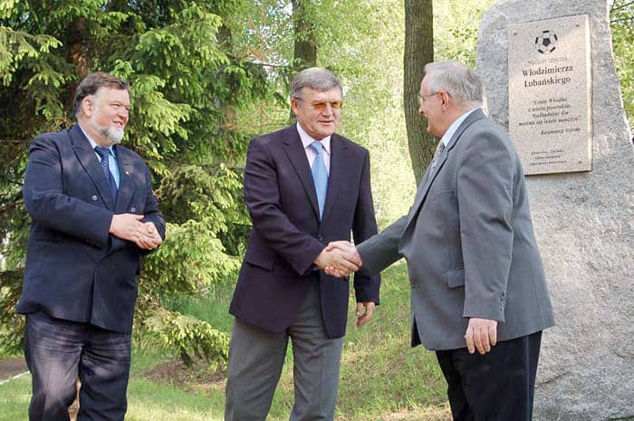 Z. Ładziński, W. Lubański i J. Kusiak (od lewej) odsłaniają pamiątkową tablicę.