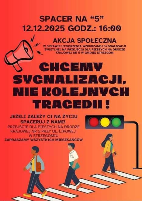 - Na piątek, 12 grudnia w godzinach 16.00 - 19.00 zaplanowano spacer na "5". Chcemy sygnalizacji, nie kolejnych tragedii. Będzie to akcji społeczna w sprawie utworzenia sygnalizacji świetlnej na tym przejściu dla pieszych - informują mieszkańcy i inicjatorzy protestu.