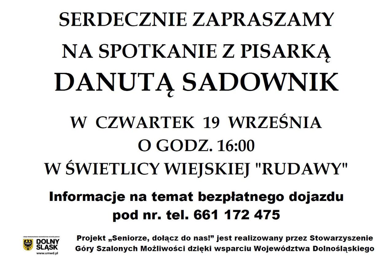 Tym razem będzie to spotkanie autorskie z Danutą Sadownik, które odbędzie się w czwartek, 19 września o godzinie 16:00 w świetlicy wiejskiej "Rudawy". Organizatorzy zapewniają bezpłatny dojazd na terenie gminy. Informacje pod nr tel. 661 172 475.