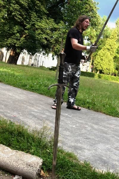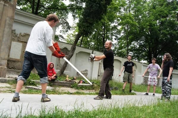 Trenują walkę na miecze. Pod Kościołem Łaski