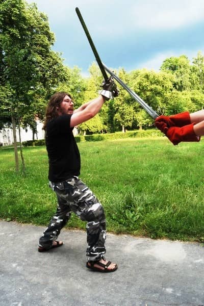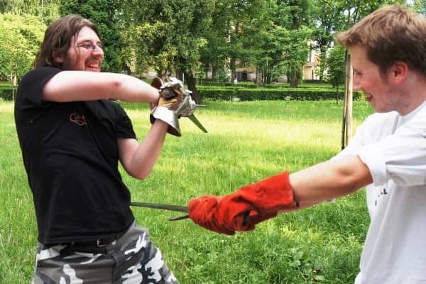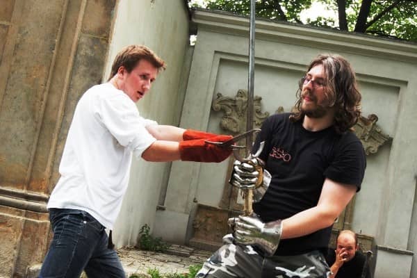 Trenują walkę na miecze. Pod Kościołem Łaski