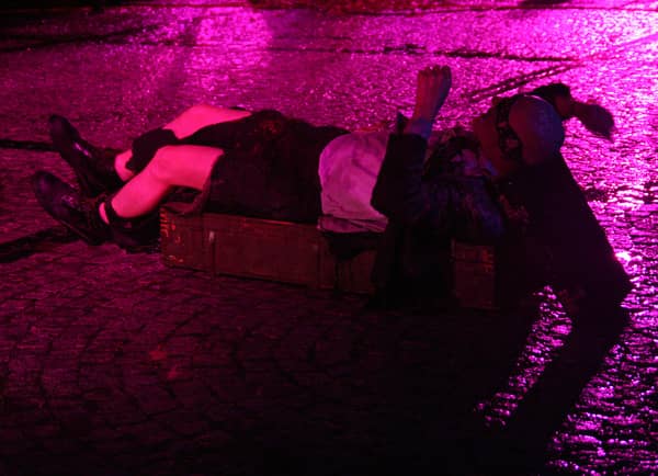 Uliczni artyści w strugach deszczu