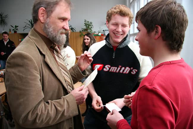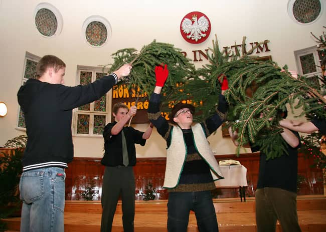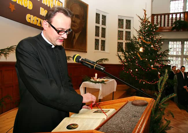Romuald Adrusyszyn, matematyk i wychowawca klasy III d z "Żeroma" dzieli się opłatkiem z licealistami.