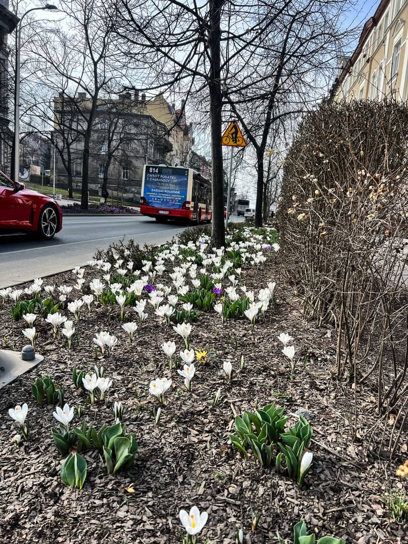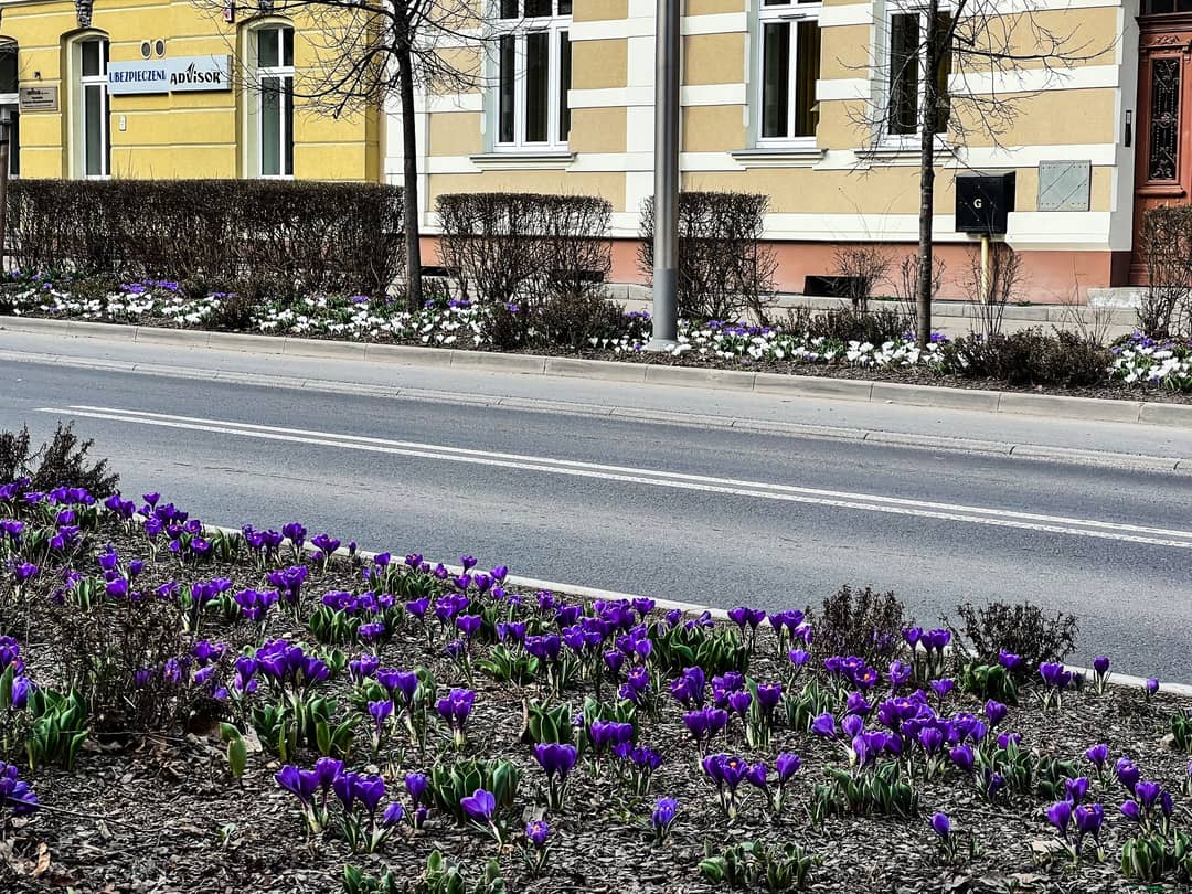 Wiosenne kwiaty w parkach i ulicach