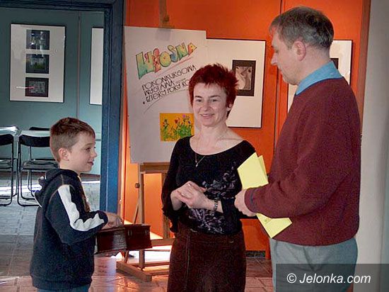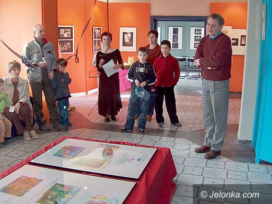 Henryk Dumin pokazuje nagrodzone prace.
