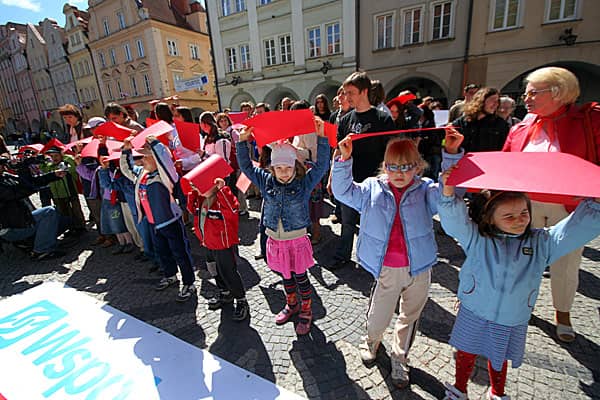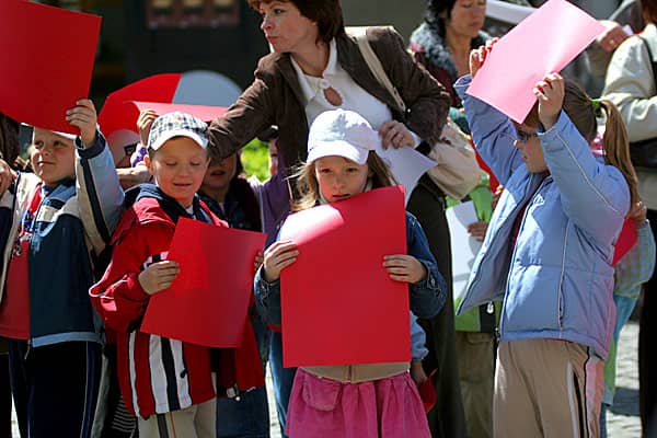 Czym skorupka za młodu nasiąknie: przedszkolne dzieci przygotowują się do pokazania "żywej" flagi.