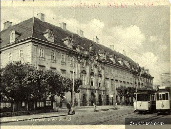 Tramwajowa mijanka przed pałacem Schaffgotschów. Tramwaje w rzeczywistości były czerwone. Panchoromatyczna klisza czarno-biała ten kolor oddawała jako biały.