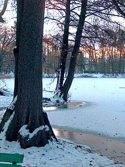 Gwarny i zielony w cieplejszych porach roku Park Zdrojowy teraz jest chłodny i cichy. Serce parku, deptak koło pawilonu parkowego jest teraz pusty. Pusto również jest nad stawem w Parku Norweskim.